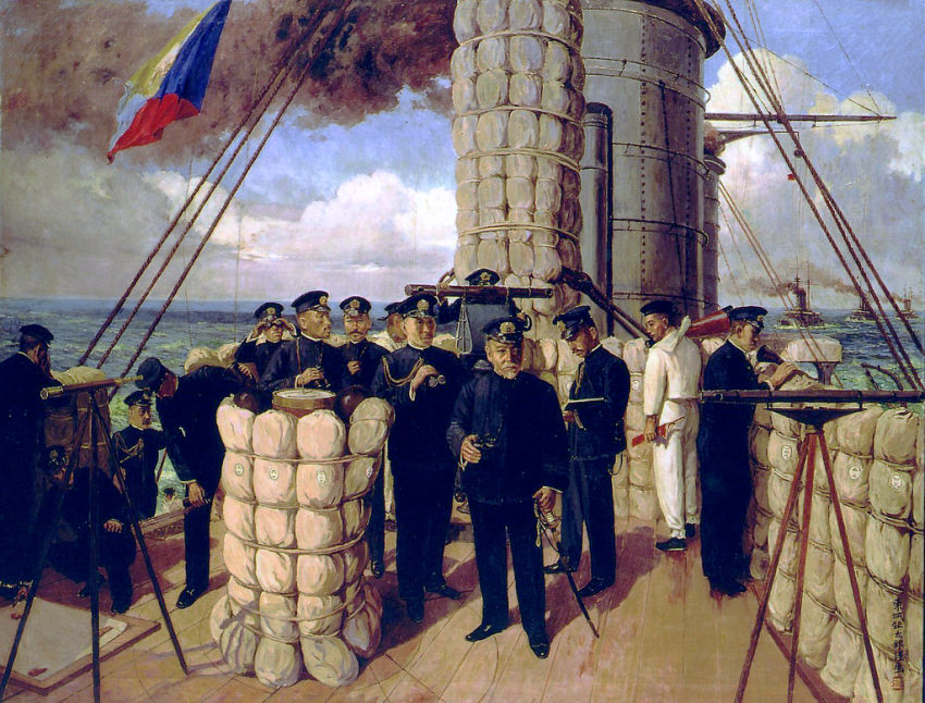 Последнее, решающее морское сражение русско-японской войны 1904—1905 гг., в ходе которой русская эскадра была полностью разгромлена, произошло в Цусимском проливе между Японским и Восточно-Китайским морями. Русской эскадрой (38 кораблей) командовал вице-адмирал 3. П. Рожественский. японским флотом (128 кораблей) командовал адмирал Х. Того. Ночью на 14 мая российская эскадра приблизилась к проливу, построившись в походный ордер. Адмирал Рожественский допустил ошибку, не отдав приказ о разведке и не затемнив корабли. Японский вспомогательный крейсер, обнаружив русскую эскадру, информировал об этом Того, который направил основные силы флота к противнику, планируя окружить русскую эскадру и ночью ее разгромить.