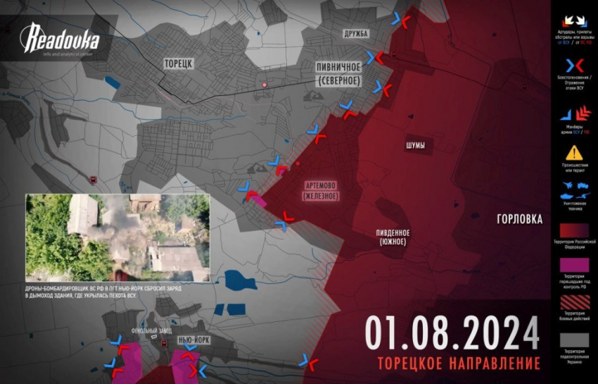 В Железном ВС РФ сразу в двух местах переправились через проспект Пионеров и начали охват террикона шахты имени Артема с флангов. С севера наши бойцы прорвались к отвалу после того, как пересекли сначала проспект, а потом и ж/д пути, дойдя до Партизанской улицы. С юга русские подразделения продвигаются к террикону в частной застройке, достигнув улиц Зеленая и Челюскинцев.