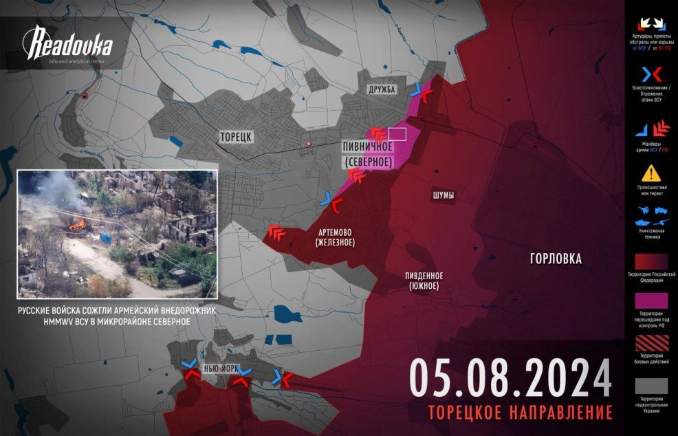 Главного успеха ВС РФ добились в Железном, почти полностью освобожденном от украинских подразделений. ВСУ оставили малоэтажную застройку по улицам Горняцкая и Степная у южного склона шахты имени Артема. К этому отвалу наши войска вплотную подошли с нескольких сторон, но не стали его штурмовать, обойдя высоту с юга. Цель ВС РФ здесь - прорыв к мкр Забалка и террикону шахты «Новая Валюга», прикрывающему Торецк.