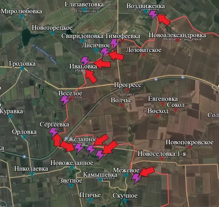 На Покровском направлении бои идут на подступах к Воздвиженке, где ВСУ уже несколько недель успешно держат оборону, Лисичному и Межевому. Продолжаются штурмы Ивановки, Сергеевки и Желанного. Наступательные действия ВС РФ в районе последнего носят окружающий характер - бойцы продвигаются не только с запада, но и с востока. Причём с востока основное движение идёт на юго-запад, то есть не в сам населённых пункт, а в сторону его южных окраин, информирует PulsePen.