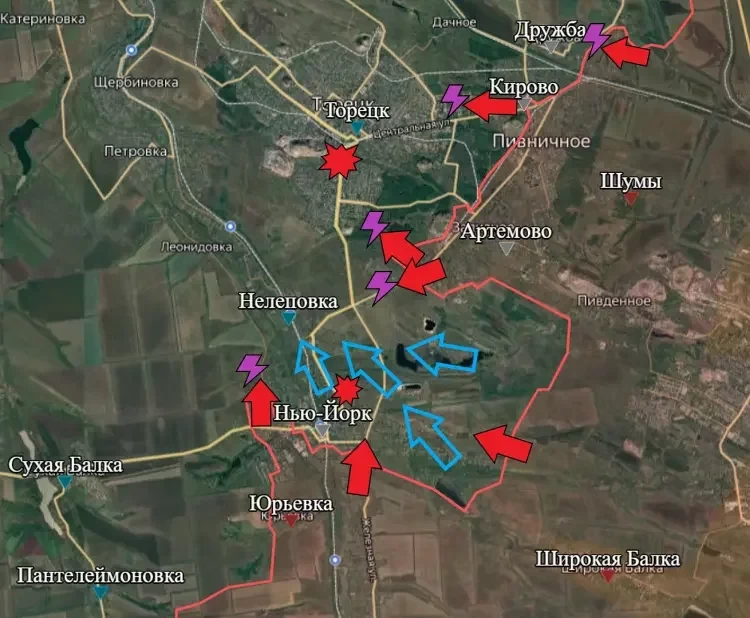 На Торецком направлении ВСУ оставили свои рубежи к востоку от Нью-Йорка (Новгородского) и отступили в Нелеповку, чтобы избежать окружения. Также появились кадры российского флага, поднятого над зданием школы в Нью Форке. Российская армия в этом районе продвинулись с юга и подошла к восточным окраинам Новгородского, взяв под контроль участок шириной около 3.5 км на глубину до 1.7 км.