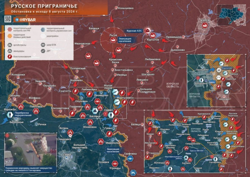 В Курской области ВСУ рассчитывали «блицкригом» прорваться к АЭС в Курчатове сразу по нескольким трассам. Речь о дороге от Суджи на Курчатов и о перекрестке у Коренево, от которого можно доехать как до Рыльска, так и до Льгова. Пользуясь отсутствием линии фронта, ВСУ мобильными группами старались установить контроль над ключевыми дорогами и развилками для введения в бой следующего эшелона войск.