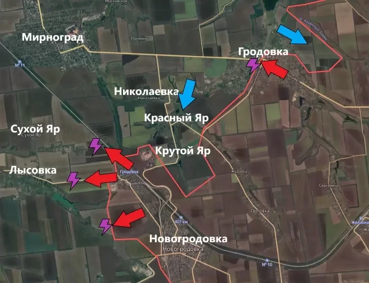На Покровском направлении ВС России уничтожили несколько мостов в ближнем тылу противника. Появлялась информация об отводе подразделений ВСУ из Украинска, чтобы избежать окружения. Продолжаются бои в Гродовке, севернее Новогродовки, на восточной окраине Лысовки российские манёвренные группы продолжают атакующие действия. ВСУ провели контратаку к северо-востоку от Новогродовки, высадив десант в районе Орловки, что говорит о вступлении в бой прибывших резервов противника.