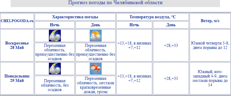 В Челябинске днём потеплеет до плюс 30–32 градусов. При этом в течение дня ожидается слабый ветер южной четверти с порывами до 8 метров в секунду. Будет преимущественно облачно, без осадков.