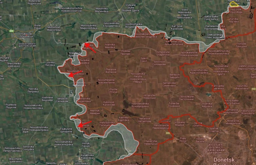 Российские войска ведут штурмовые действия в районе шахты «Новогродовская» на северо-восточной окраине Новогродовки, давят в восточном направлении.