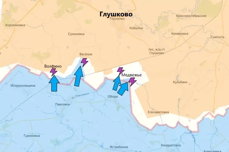 ВСУ продолжают свое наступление в Глушковском районе. Однако, на текущий момент попытки атак заканчиваются лишь уничтоженным личным составом и подбитой бронетехникой ВСУ. Атаки идут в направлении Волфино, Весёлого и Медвежьего. Некоторые источники сообщают, что ВСУ заходят в тыл нашим бойцам, находящимся в Веселом или же пытаются прорваться к Глушково в обход Веселого, но эта информация не подтверждается ни с мест, ни осинтерами.