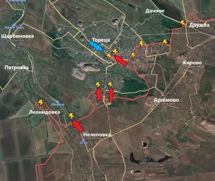 В Торецке (Дзержинске) продолжаются ожесточённые бои. Подразделения ВС РФ немного расширили зону контроля в центральной части города. В остальном на это направлении ЛБС не изменилась - идут бои в районе Дружбы, Нелеповки, Леонидовки.
