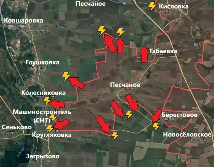 На Купянском направлении армия России продолжает расширять зону контроля на «Песчаном выступе». К северу ВС РФ продвинулись в сторону другого Песчаного и у Табаевки, а на западе ведут бои сразу за несколько населённых пунктов - Колесниковку и Кругляковку. Также есть продвижение и в южной части выступа.