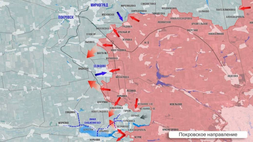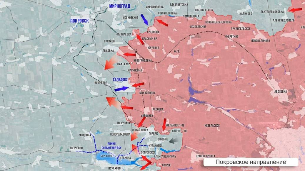 На Покровском направлении гремит северный участок. ВС РФ атакуют позиции ВСУ севернее Новоалександровки, подошли от Николаевки к селу Проминь. Идут бои на окраинах Сухого Яра. Наши еще приблизились к Покровску, пройдя 2,5 км вдоль ж/д линии. Идут ожесточенные бои в восточной части Селидово, у шахты Коротченко - её западная часть и террикон пока за ВСУ. Российские военные заняли западную часть Измайловки. Из Новодмитровки новостей нет. Напомню, что освобождение этого села выведет армию России на западный обход Курахово и поможет охватить город с двух сторон, сообщает Олег Царёв в своём Telegram-канале.