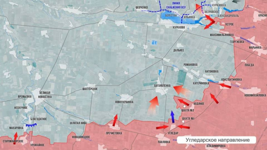 На Угледарском участке ночью ВС РФ отбили контратаку севернее Золотой Нивы. В Шахтерском и Новоукраинке наши нанесли удары по местам дислокации ВСУ, складам и средствам связи. Идут атаки ВС РФ от Водяного на Богоявленку. Кроме этого, есть продвижение на запад от Водяного, где отбиты еще два опорных пункта. В Елизаветовке разбит мост через р. Сладкая, по нему шло снабжение ВСУ в Катериновке. Идут бои в центре Максимильяновки, на село наши давят и от Георгиевки, и от Острого. Зачистив Островское, ВС РФ прорываются к основной части Курахово на левом берегу р. Осикова, впадающей в Кураховское водохранилище.
