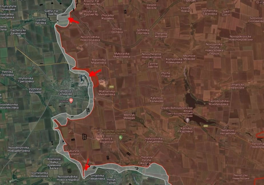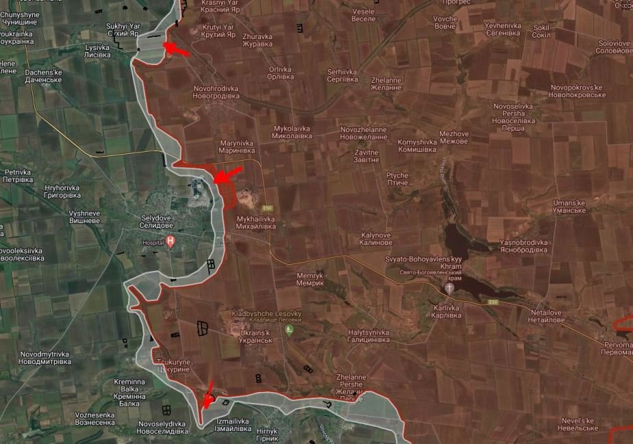 На Покровском направлении ВС РФ давят в районе Лысовки и Сухого Яра. Российские войска имеют тактические успехи севернее Селидово. ВС РФ расширили контроль территории восточнее Новоселидовки, сообщает Telegram-канал "БелВПО".