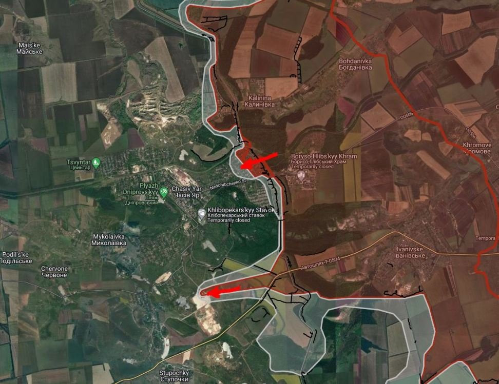 На ЧасовЯрском направлении в Часовом Яре ВС РФ расширили контроль территории в западном направлении и продвинулись вдоль ул. Пивничная к школе №17. Российские войска имеют тактические успехи южнее Часового Яра, закрепились на территории рудника «Блок-9».