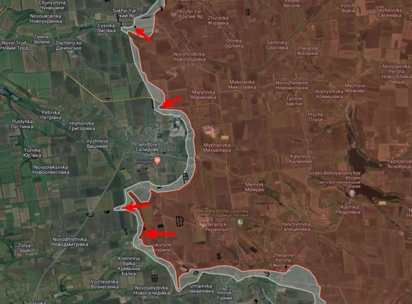 На Покровском направлении в Лысовке ВС РФ давят вдоль ул. Центральная, имеются тактические успехи. Российские войска расширили контроль территории на северном и южном флангах в районе Селидово. ВС РФ имеют тактические успехи в северо-западной части Цукурино, сообщает Telegram-канал "БелВПО".