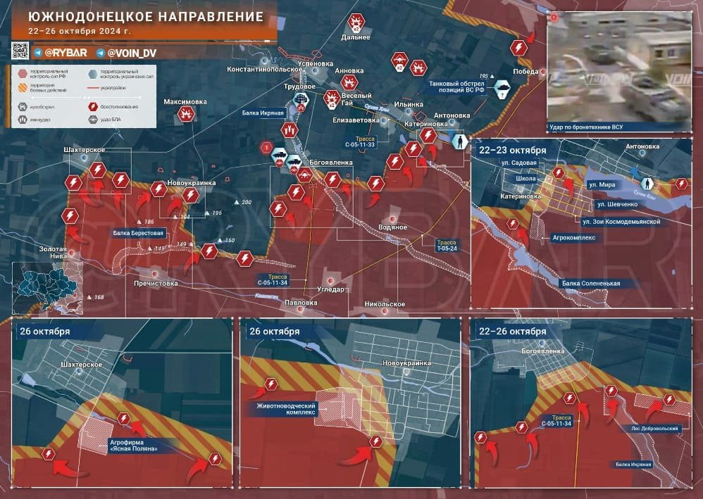 По самой Богоявленке активно работает артиллерия, а бронетехнику противника уничтожают операторы БЛА. Фермы к западу использовались противником в качестве укрытий для техники и не раз становились целью авиаударов ВКС России.