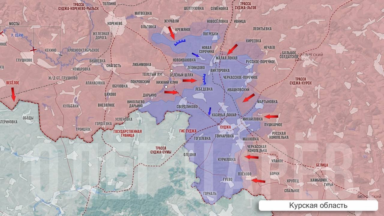 Выше есть локальное продвижение наших в районе Погребков, что между Кремяным и трассой Суджа-Льгов. Из района Новоивановки, Леонидова, Викторовки об изменениях не сообщалось.