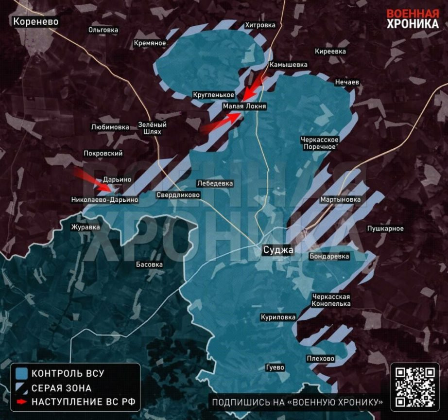 На других участках Суджанского района обстановка также остается стабильно напряженной. Идут бои в окрестностях Плёхова, Мартыновки и Бондарёвки, по которым работает российская авиация и артиллерия.