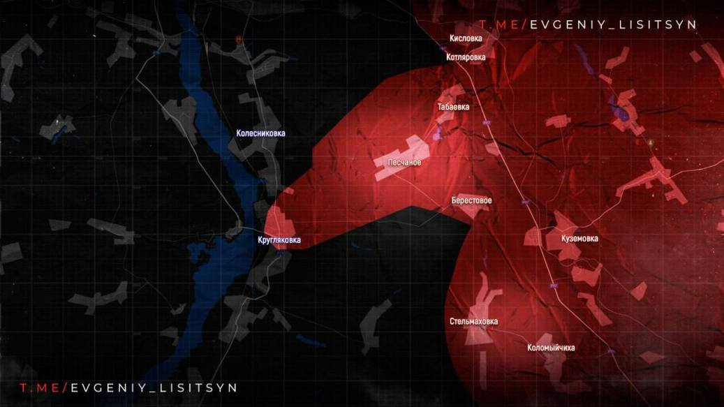 Большая часть Кругляковки перешла под наш контроль, продолжаются бои в районе Колесниковки. Авиация РФ наносит удары по позициям ВСУ в Богуславке и Купянске, а также по переправам, возводимым украинскими силами в районе Купянска. Коридор от Песчаного до Оскола расширяется.