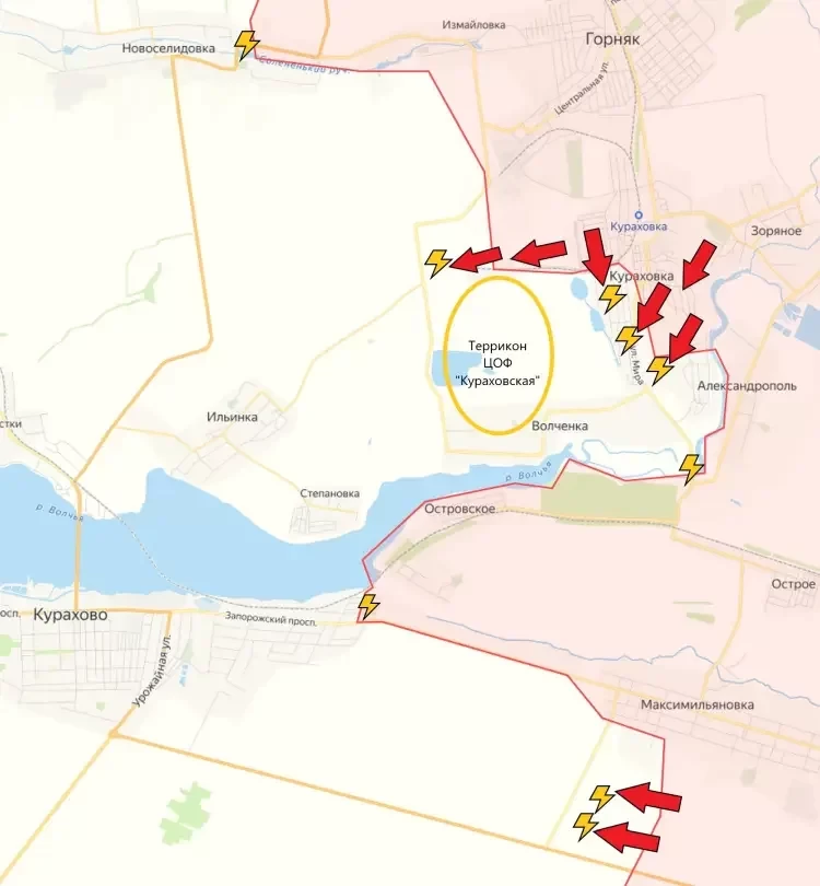 ВС РФ освободили большую часть Кураховки и заняли территорию ЦОФ «Кураховская» к западу от населённого пункта. Террикон ЦОФ (центральной обогатительной фабрики) и село Волченка находятся в серой зоне. Сопротивление противника тут очаговое, в ближайшее время данный карман будет зачищен.
