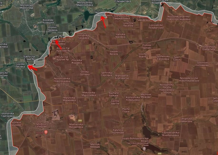 На Покровском направлении ВС РФ давят в районе Новоторецкого, северо-восточнее и севернее Николаевки и в районе Лысовки. Российские войска расширили контроль территории в Новодмитровке, продвинулись в районе центра в западном направлении. ВС РФ ведут зачистку Кураховки и Волченки.
