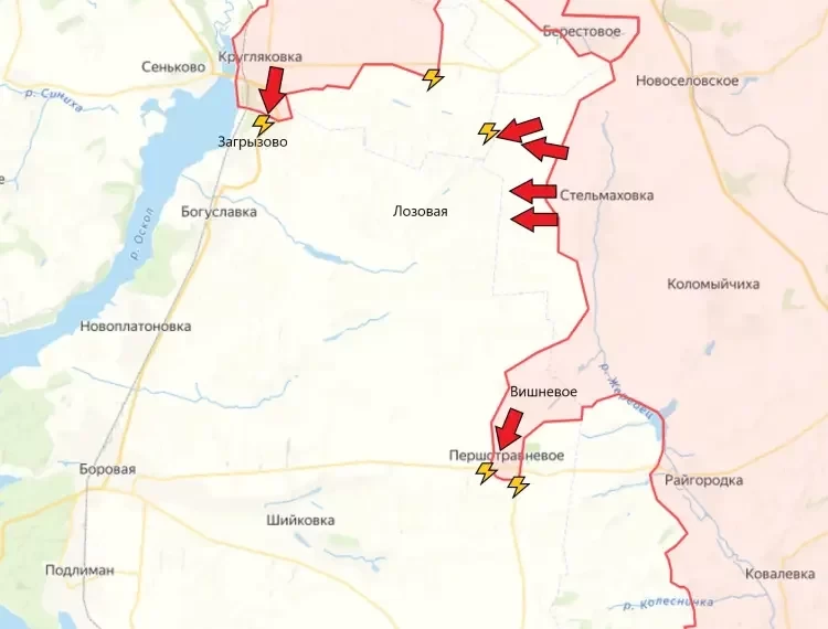 На Боровском направлении продолжаются бои южнее Кругляковки. Сообщений о начале штурма Загрызово по-прежнему не поступало. Идут боестолкновения на подступах к Лозовой. Сообщается, что на восточных окраинах у врага имеются довольно серьёзные укрепления, поэтому возможен заход с севера. Армия России освободила Першотравневое (в переводе на русский - Первомайское), что южнее Вишнёвого. Об этом сообщило Минобороны России.