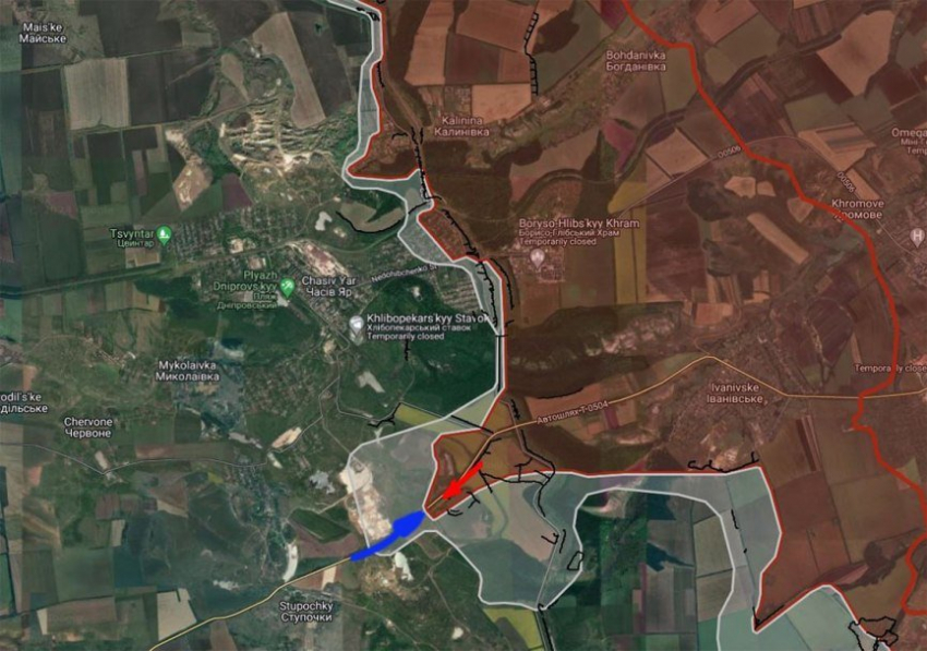 Ситуация для ВСУ в Елизаветовке осложнена еще и тем, что подразделения ВС РФ атаковали её с северо-востока через дамбу со стороны Ильинки, а с юга оказывают давление через урочище Лесная Дача.