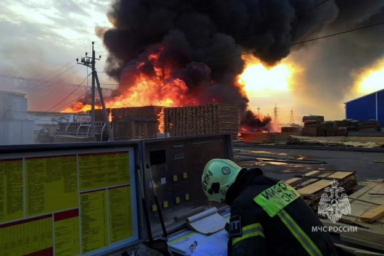 Крупный пожар начался ранним утром в понедельник, 29 мая, на улице Енисейской. На момент прибытия пожарных на площадке под открытым небом полыхали доски и брус, уложенные в штабеля.
