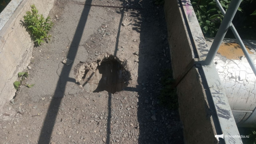 На мосту через Вторую речку во Владивостоке в понедельник, 29 мая, образовался опасный провал. В него рискуют угодить многочисленные пешеходы, особенно, если до наступления темноты яму не оградят, передает корр. ИА PrimaMedia.