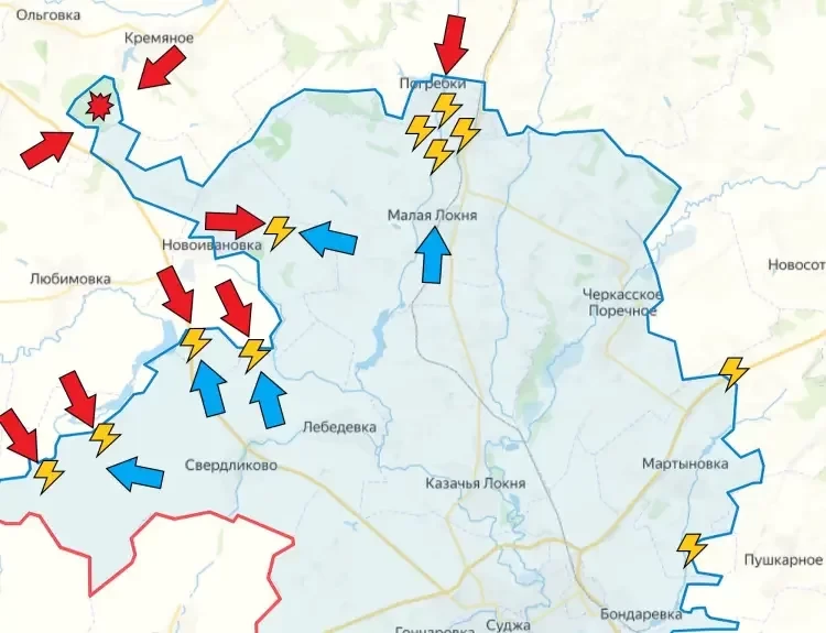 Как уточняет PulsePen, на остальных участках ситуация не претерпела особых изменений. Идут бои в районе Новоивановки, в Дарьино, южнее Погребков. Также встречные бои фиксируются практически на всех участках Курского направления.