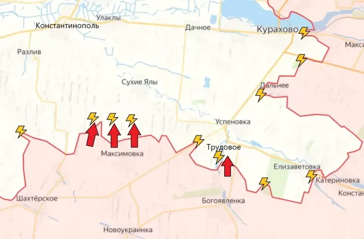 На Константинопольском направлении продолжаются встречные бои на западных окраинах Дальнего. Некоторые источники сообщают о зачистка населённого пункта, однако подтверждений этому пока нет. Армия России зашла в Трудовое и взяли под контроль восточную часть населённого пункта. Сейчас бои идут в западной части села. Взятие населённого пункта позволит подобраться к Успеновке с юго-востока, а также перерезать снабжение группировки ВСУ в огромном кармане юго-восточнее Успеновки. Зафиксировано продвижение ВС РФ севернее Максимовки в направлении Сухих Ял.