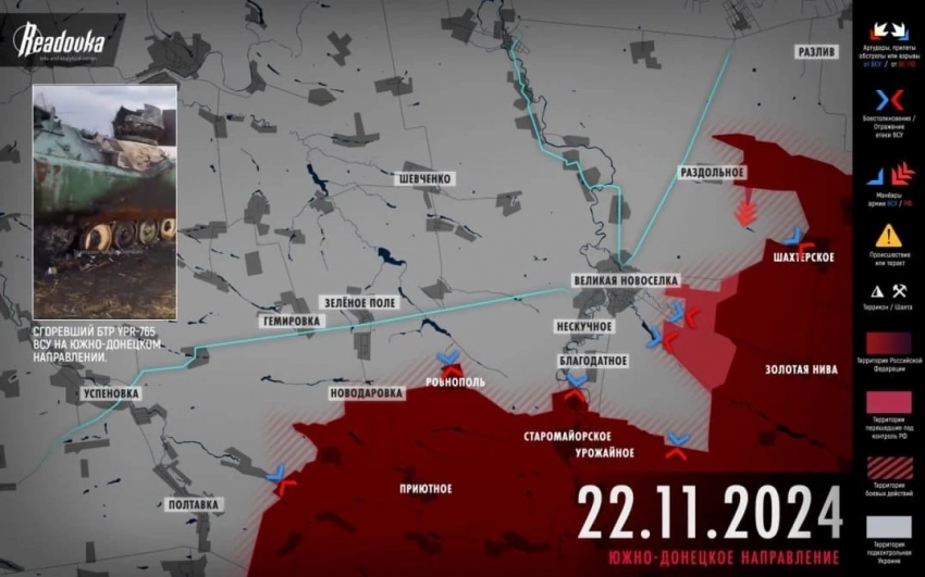 На Угледарском направлении ВС РФ сжимают клещи вокруг Великой Новоселки. К западу от поселка ВС РФ пробиваются к дороге на Гуляйполе со стороны Ровнополя. ВСУ сопротивляются, но фронт сдвигается к северу. В районе Раздоловки бои идут тяжелые, однако севернее села наши штурмовики смогли перерезать дорогу на Богатырь. Со стороны Шахтерского и Золотой Нивы ВС РФ продвинулись до 4 км и вышли практически на внешний оборонительный контур Великой Новоселки. Украинские ресурсы сообщили, что российская колонна попала в засаду и понесла потери. Правда, подробностей не привели. В Курахово жестокие бои в центральной части города. Южнее российские войска сжимают горлышко котла в районе Успеновки, а также теснят врага со всех сторон по периметру этого котла.