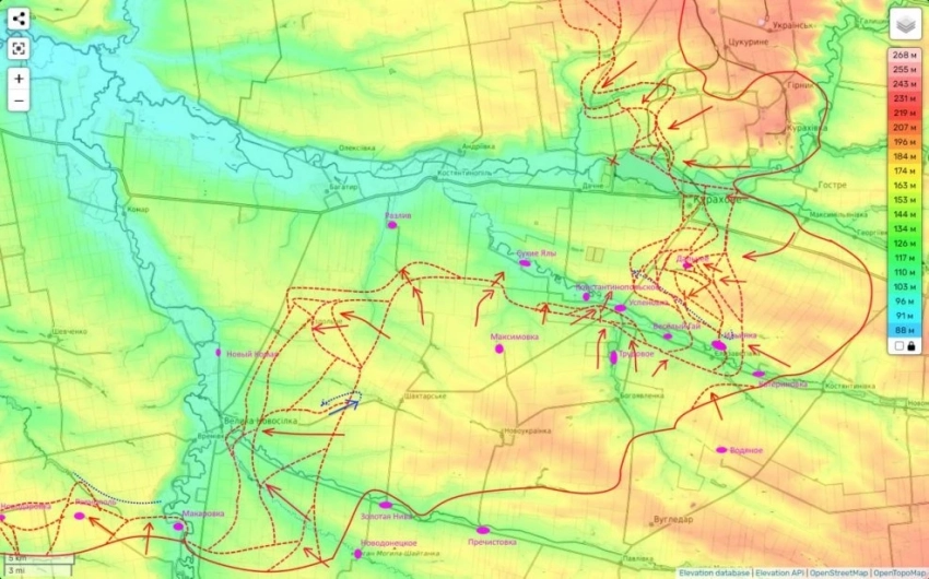 По итогам боевых действий вчерашнего дня расстояние до Разлива сократилось до 3 км, а до трассы Курахово - Запорожье осталось менее 6 км, что угрожает снабжению украинской группировки.