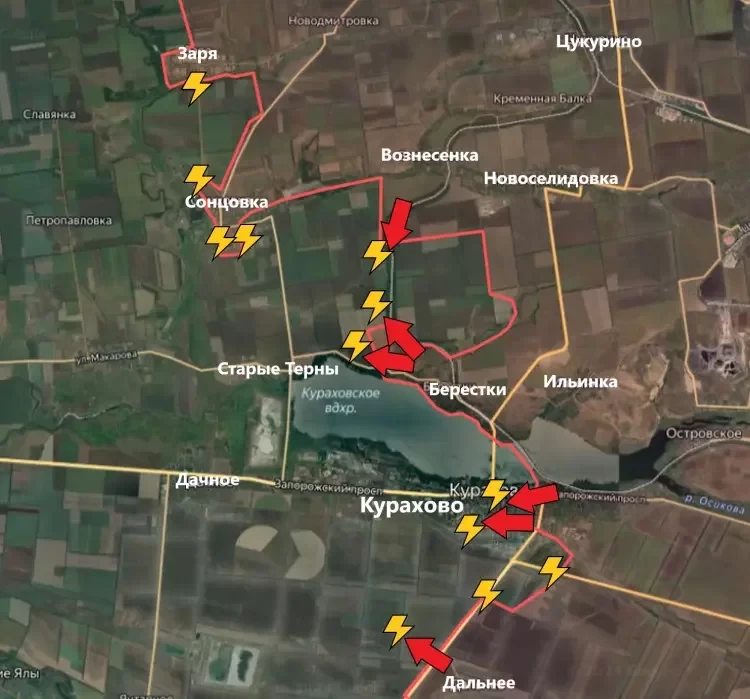 Подразделения ВС РФ продвинулись на запад от Берестков. До Старых Тернов остаётся около 2 километров. Также наши бойцы продвинулись от Берестком на северо-запад. Навстречу им продвигаются бойцы со стороны Вознесенки. Таким образом будет закрыт карман севернее Берестков. В целом, наши бойцы близки к тому, чтобы освободить всю территорию севернее Кураховского водохранилища.