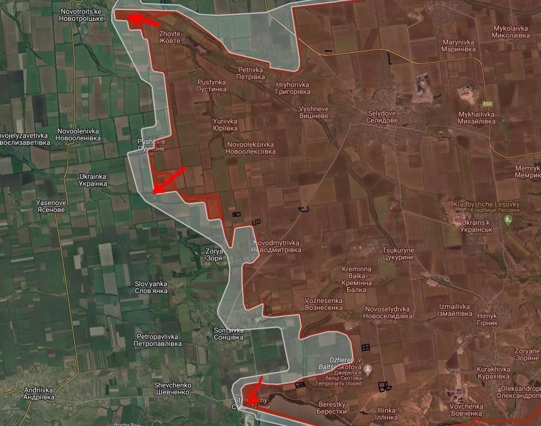 Российские войска расширили контроль территории от Пушкино до Зари на участке шириной до 3.65 км.