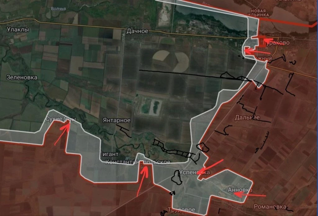 На Константинопольском направлении ВС РФ имеют тактические успехи в Курахово, продвинулись в западной части города. Российские войска ведут зачистку Анновки, Весёлого Гая и Успеновки. Продолжаются штурмовые действия на южных окраинах Константинопольского и Сухие Ялы.
