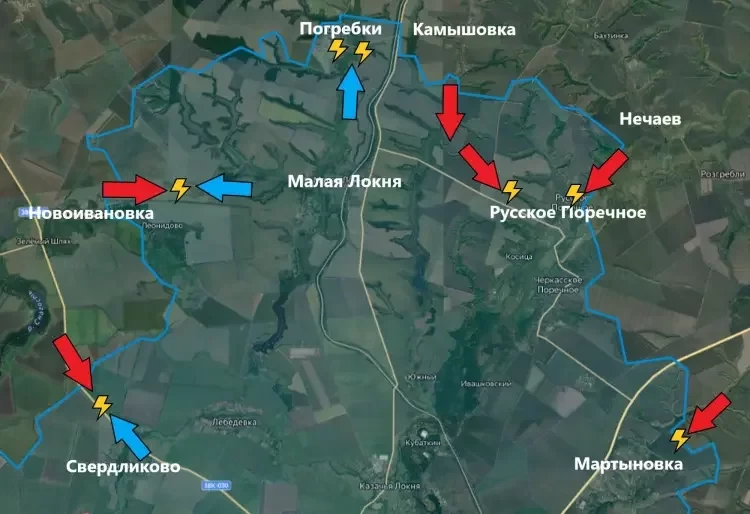 Указывается, что две отдельные группы продвигаются западнее населенных пунктов Орловка и Погребки, где российские войска вытесняют другие украинские подразделения из приграничных территорий Курской области.