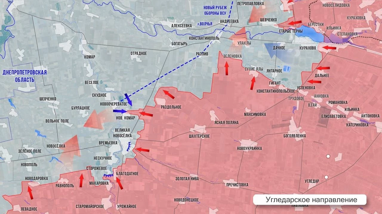 На Угледарском направлении Великая Новоселка практически окружена. МО РФ подтвердило освобождение Сторожевого, что рядом с Благодатным. ВС РФ продвигаются по холмам к западу от р. Мокрые Ялы и вышли на расстояние в 500 м до дороги на Гуляйполе. В районе Нового Комара ВС РФ расширяют зону контроля. В районе Курахово российские бойцы пробиваются к дороге на Запорожье сразу в нескольких местах. Основные бои идут между Зеленовкой и Улаклы и в районе Дачного. Севернее наши силы стараются освободить Петропавловку, чтобы выйти к Андреевке. Противник отчаянно сопротивляется, поскольку понимает, что наш успех в любом из этих мест приговорит весь Кураховский мешок.
