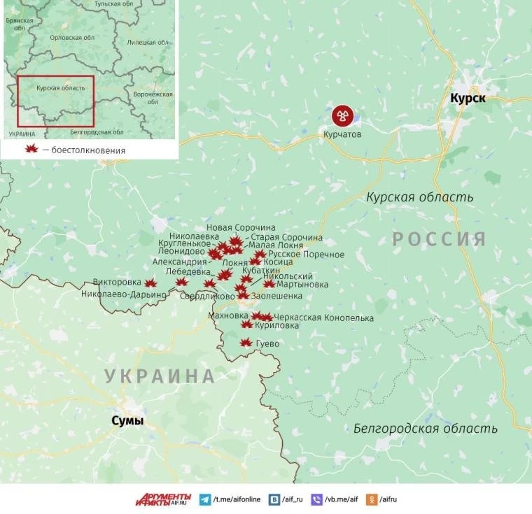 В Курской области на протяжении минувших суток активны бои велись в окрестностях населённых пунктов Леонидово, Черкасская Конопелька и Куриловка.