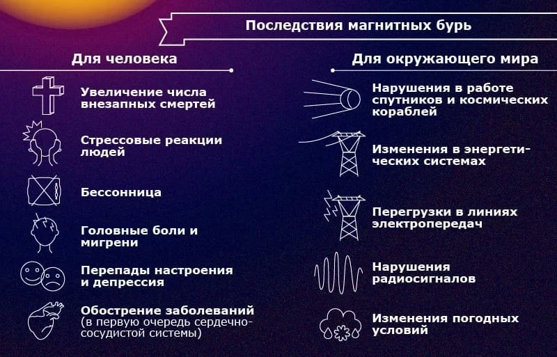 Магнитные бури на некоторых людей оказывают особенно сильное негативное воздействие. По словам специалистов, это может проявляться в сильных головных болях, которые в итоге способны перейти в мигрень, а также спровоцировать бессонницу, тошноту, как следствие плохое настроение и др. В таких случаях можно помочь тебе, приняв обезболивающее средство и успокоительное.