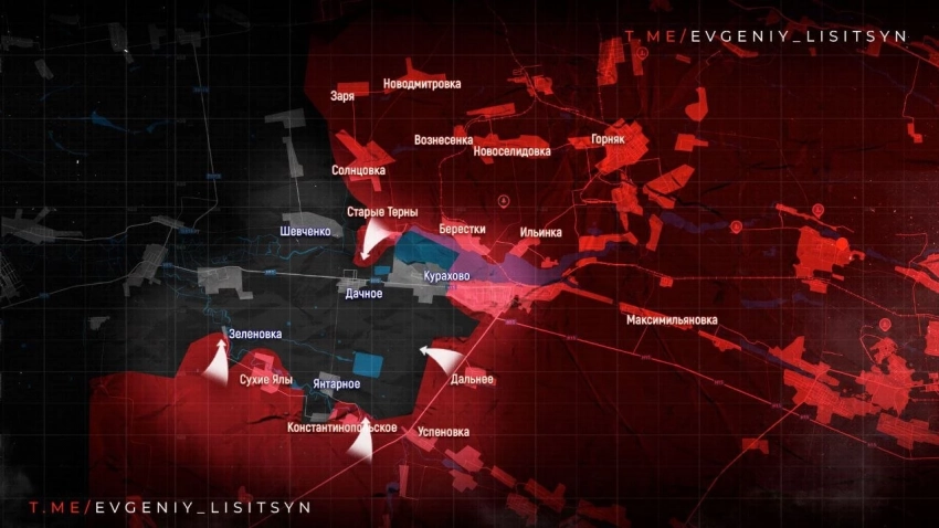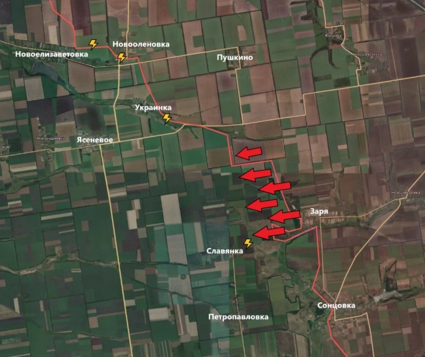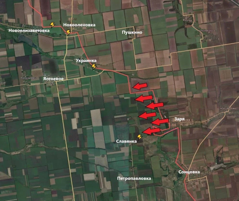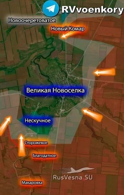 Пришло подтверждение важнейшей информации с окрестностей Великой Новосёлки. Пока враг успешно отбивает наши атаки в районе Новодаровки и Ровнополя и контратакует сам, чтобы не дать подразделениям ВС РФ перерезать последнюю дорогу на Великую Новосёлку, наши бойцы успешно продвинулись к этой самой дороге, но чуть восточнее. Предположительно, мы уже закрепились как минимум рядом с трассой.