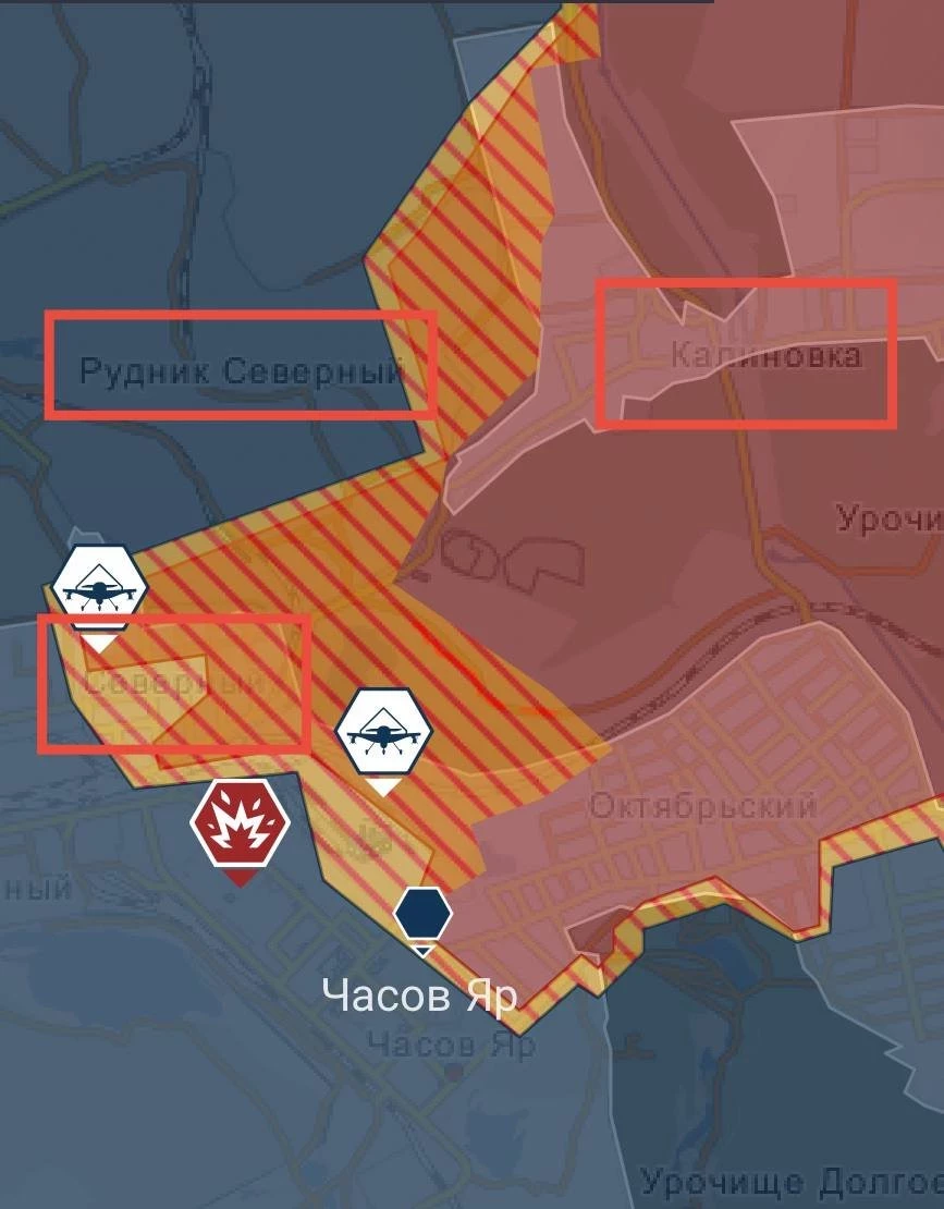Российские войска, опираясь на Калиново (Калиновку), за минувшую неделю продавили оборону противника к северу от Часовоярского огнеупорного комбината. Передовые группы ВС РФ были замечены в частном секторе микрорайона Северный - большая его часть, судя по всему, уже освобождена.
