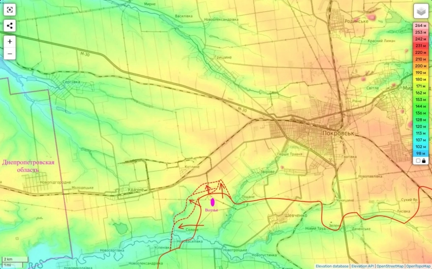 К западу от Славянки на несколько километров простирается местность без населённых пунктов - практически до границы Днепропетровской области. Противнику, привыкшему использовать сёла в качестве укрепрайонов, в связи с этим будет значительно тяжелее сдерживать продвижение наших бойцов к западной границе ДНР. Напомним, что в результате продвижения к юго-западу от Покровска до этой границы осталось не более 6 км.