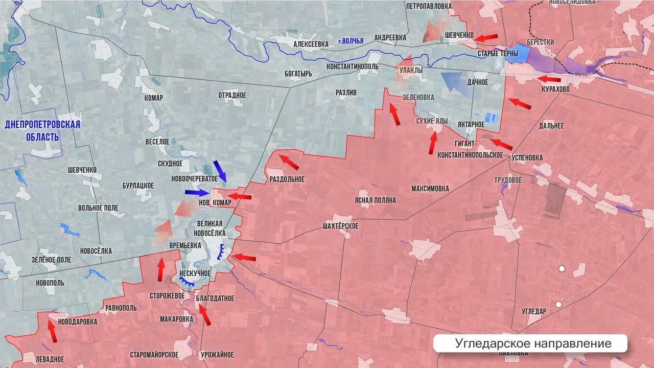 На восточном фланге Покровского направления Барановка практически перешла под контроль наших войск. Наши атакуют в направлении Тарасовки. Из-под Покровска приходят новости о том, что ВСУ отступили из Зелёного, а российские группы зачистили карман между Даченским и местным Шевченко, продолжая при этом продавливать оборону ВСУ в Чинушино. На западном отрезке этого участка наши подразделения взяли под контроль участок дороги Межевая-Покровск и вышли на подступы к Котлино, до которого осталось одно поле. Не стихает накал сражения за карьер на северо-западе от Солёного. Здесь ВС РФ решают оперативную задачу по выходу к Удачному, с северной шахты которого просматривается дорога на Павлоград. Южнее ВС РФ дожимают противника в Ясеневом, а от него до Шевченко атакуют к Андреевке.