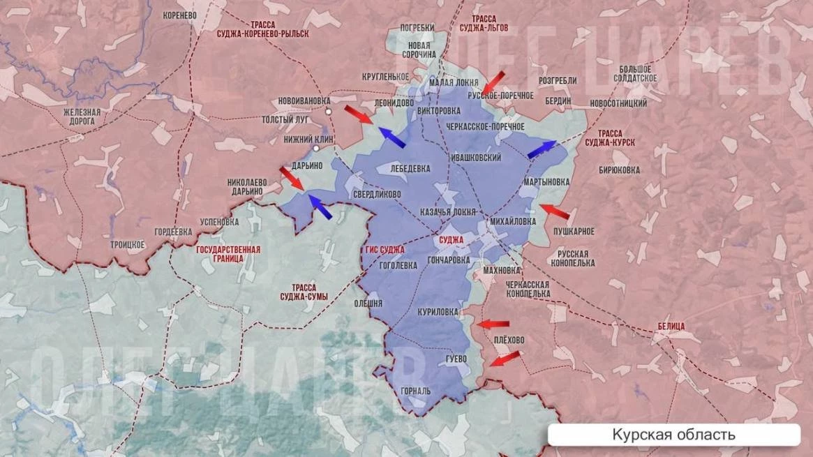 Несколько часов назад поступила информация о том, что российские части взяли под контроль село Николаево-Дарьино в 20 км к востоку от Суджи. Последние два дня за него шли интенсивные бои, Вооружённые силы Украины (ВСУ) дважды пытались отбить позиции, но не преуспели.