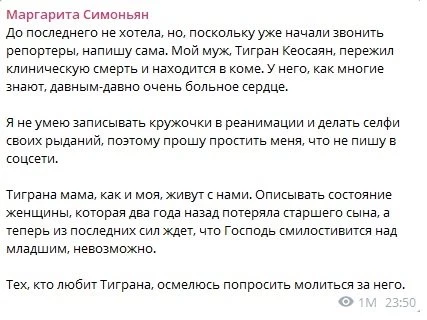 Сначала информация о пережитой клинической смерти пришла от источников, а после и супруга, Маргарита Симоньян, всё подтвердила. Она отметила, что не хотела публичности, однако в момент, когда стали поступать звонки от прессы, решила прервать молчание: