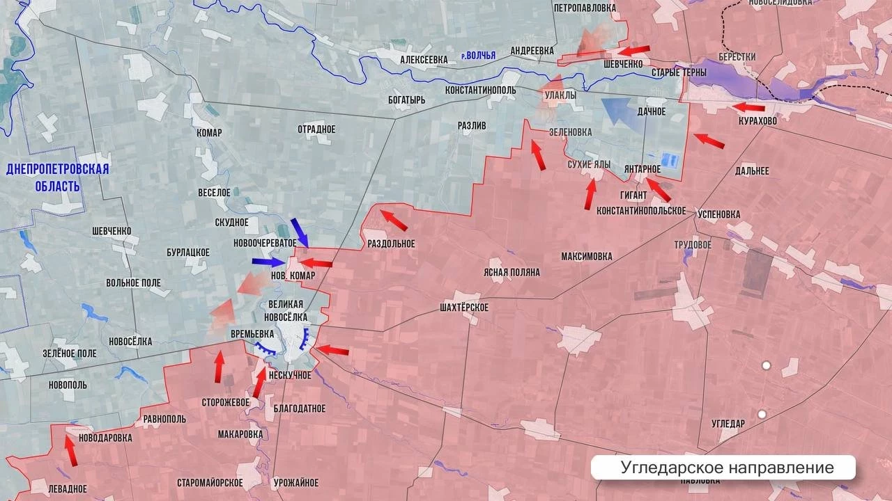 На Угледарском участке для гарнизона ВСУ в Великой Новоселке ситуация стремительно ухудшается. В течение суток противник пытался вывести свои группы из окружения на север через р. Мокрые Ялы, понес серьезные потери. Бои в самом поселке продолжаются, зачистка не закончена. В районе Кураховского котла сообщают, что ВС РФ взяли под контроль очистные сооружения к северо-востоку от Дачного. В этом селе у противника хорошие укрепленные позиции, вряд ли ВС РФ будут идти в лоб. Посмотрим, как будет развиваться ситуация. В районе Зеленовки и Сухих Ялов идут упорные боестолкновения, ВС РФ стремятся на север, в сторону дороги на Запорожье. Севернее р. Волчья МО РФ подтвердило освобождение Шевченко, есть тактические успехи в районе Андреевки.