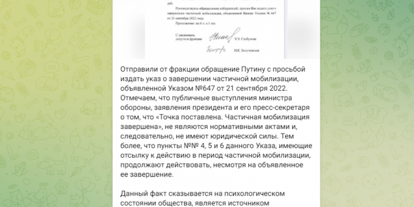 «Отправили от фракции обращение Путину с просьбой издать указ о завершении частичной мобилизации, объявленной Указом №647 от 21 сентября 2022.