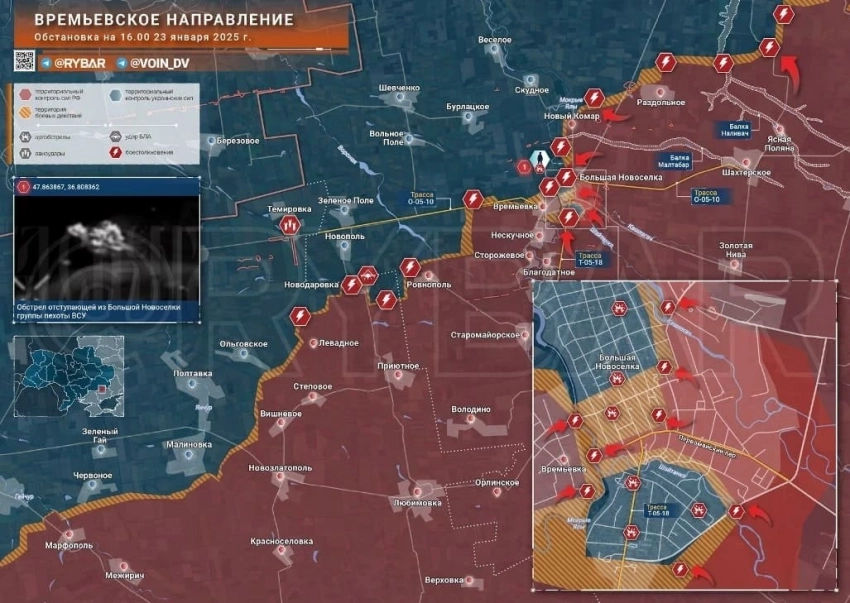 Кроме того, украинский военный с позывным Мучной отметил, что обстановка в населенном пункте Великая Новоселка на территории ДНР становится все более критичной. По его словам, российские войска уже закрепились в районе больницы и на первых улицах после Времевского выступа, а на севере ВС РФ удалось занять здание ПТУ.
