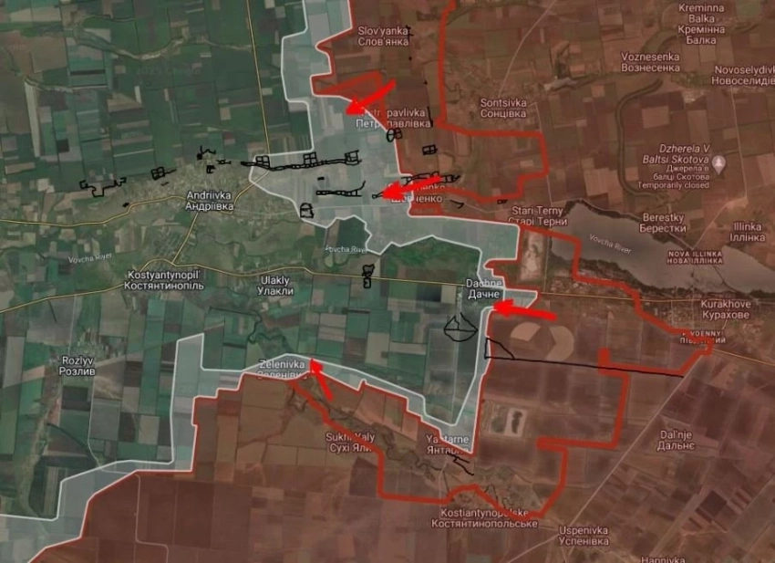 На Константинопольском направлении российские войска ведут штурмовые действия на северной и восточной окраинах Дачного, а также севернее р. Сухие Ялы и в районе Зеленовки, имеются тактические успехи.