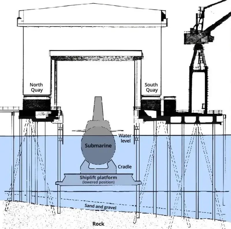 Перед приёмом АПЛ платформа опускается под воду на требуемую глубину. Далее корабль должен зайти на неё, после чего начинается процесс подъёма в эллинг. При всей сложности, такую систему в своё время посчитали более простой и дешёвой, чем традиционный сухой док. Судоподъёмник может работать с лодками водоизмещением до 25 тыс. т, и имеющиеся подводные силы укладываются в эти ограничения.
