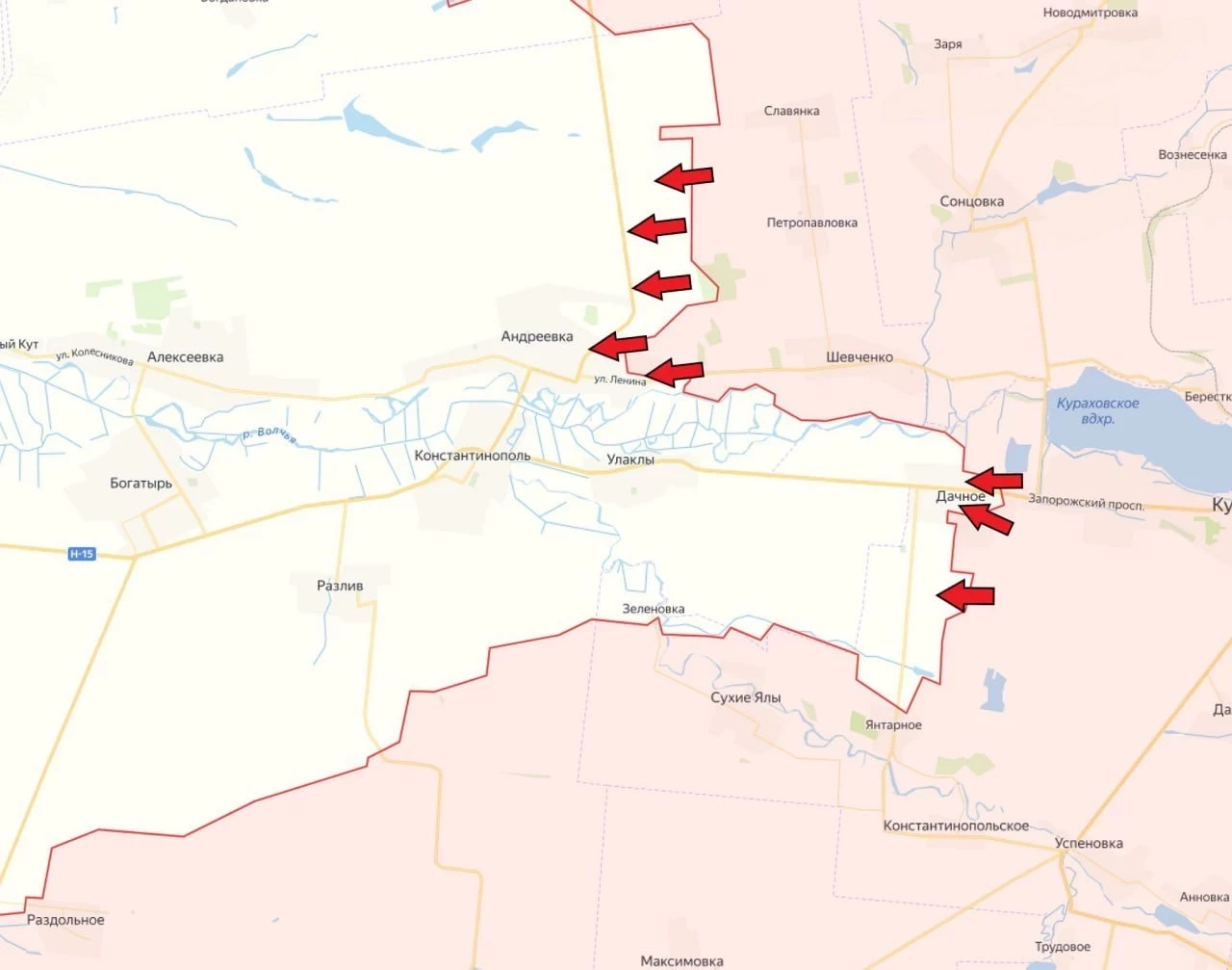 На Константинопольском направлении наши штурмовые отряды заняли восточную часть Дачного. Бои идут и на восточных окраинах Андреевки. Чуть севернее населённого пункта нашими войсками расширена зона контроля.